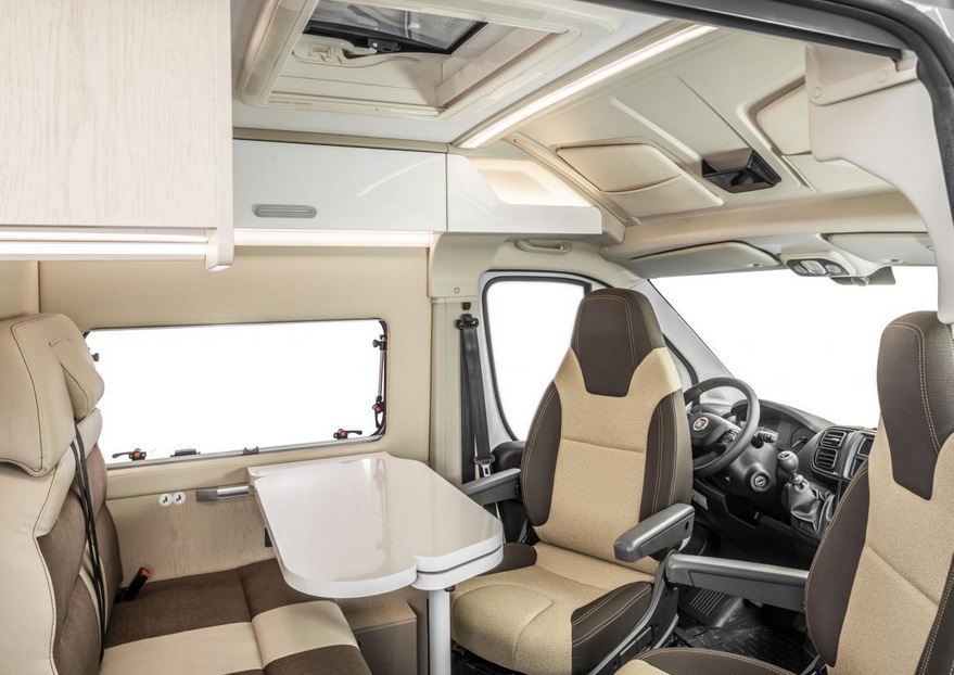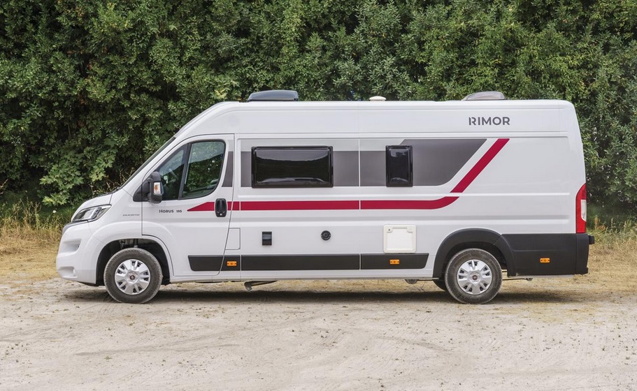 Jako příklad můžeme uvést oblíbený polointegrovaný obytný vůz Rimor Evo 95 vhodný až pro 5 osob na jízdu i na spaní, vůz má přední stahovací lůžko. V základní výbavě najdete například tempomat, asistent rozjezdu do kopce, rádio (DAB/USB/MP3/Bluetooth, start/stop systém, elektrická zrcátka, 2x airbag, ABS, ESP, ASR, tónovaná okna s roletami a moskytiérou, otočné sedačky v kabině řidiče, nádrž na čerstvou vodu 85 l, na odpadní 100 l, lednice 140 l, tříplotýnkový plynový vařič, velké dveře do garáže, přístupné z obou stran, klimatizace v kabině řidiče.